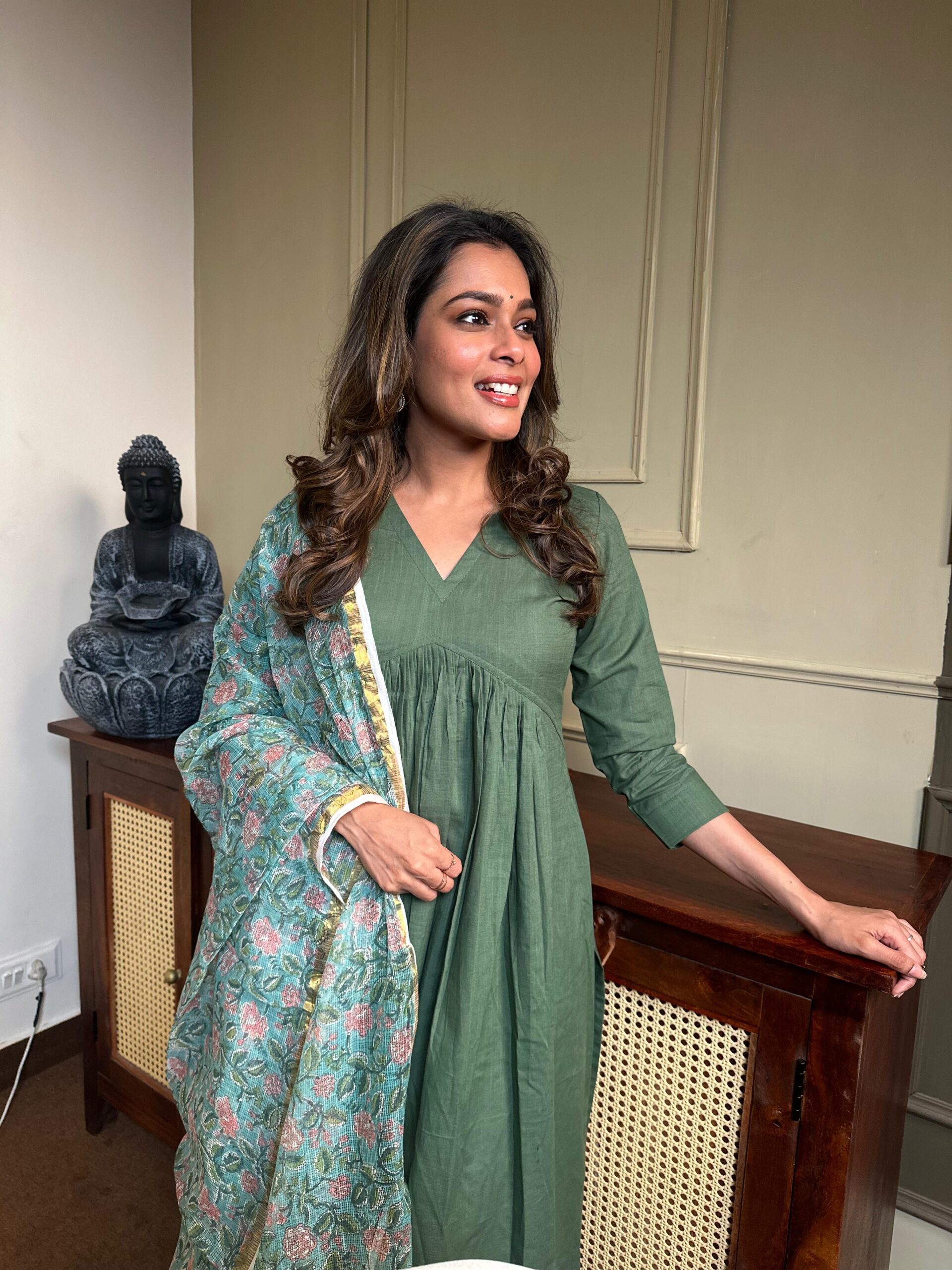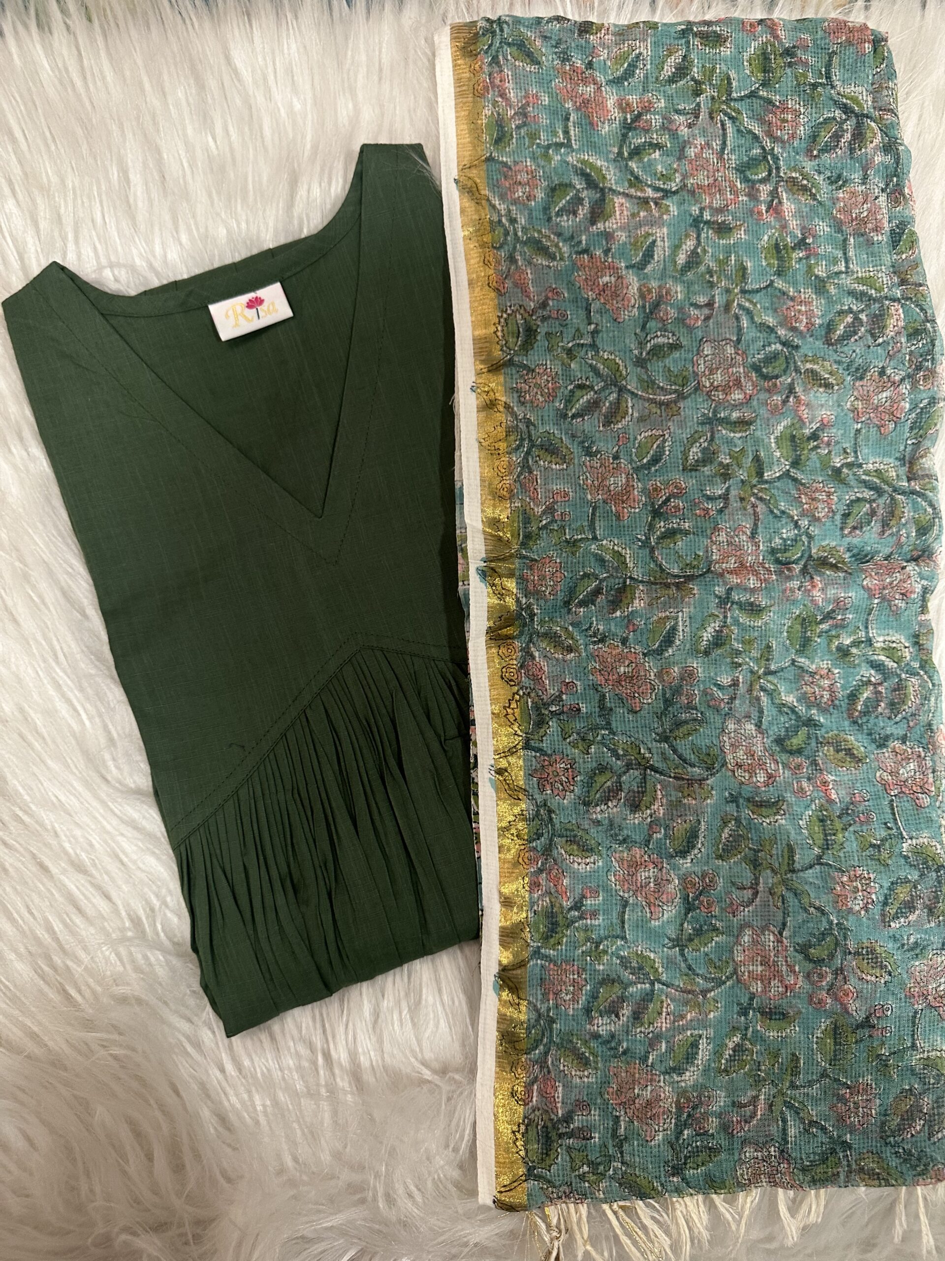 Mehandi green inverted yoke kurta with kota dupatta